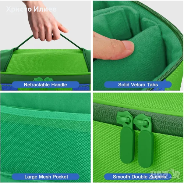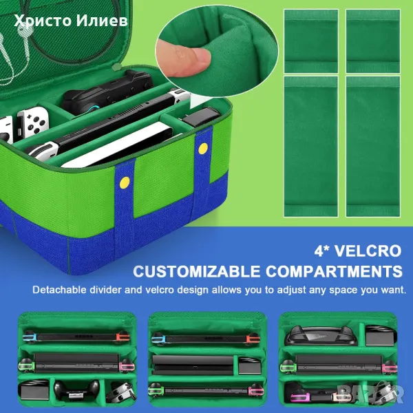 - ГОЛЯМ РЕГУЛИРУЕМ КАПАЦИТЕТ И 4* РАЗДЕЛИТЕЛ С ВЕЛКРО Калъфът за носене на Switch е оборудван със супер голям капацитет за съхранение, мрежест джоб и 4* фиксирана защита с велкро. Големият капацитет може да бъде разделен на множество отделения с 4* адаптивни отделения, идеални за съхранение на цялата ви система Switch като Joycon, професионални контролери, докинг станция Switch, AC адаптер и други аксесоари. Мрежестият джоб е идеален за съхранение на по-малки аксесоари като HDMI кабели, USB кабел, слушалки, карти за игри и др.