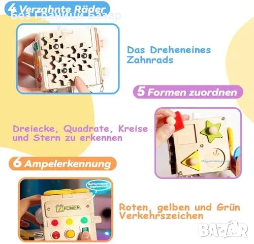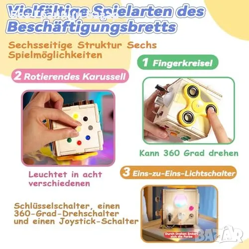 6 страни на забавление: Разнообразие от дейности като светещи елементи, въртящи се части, пъзели и интерактивни превключватели.