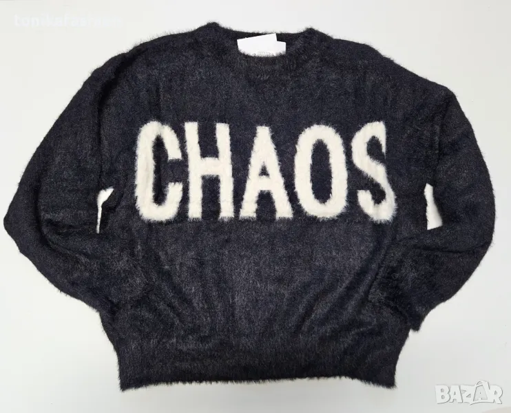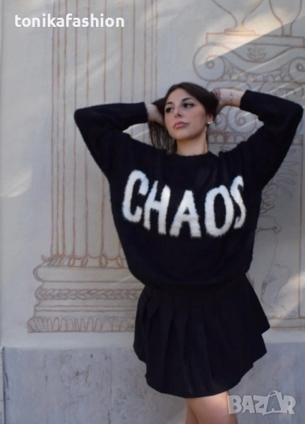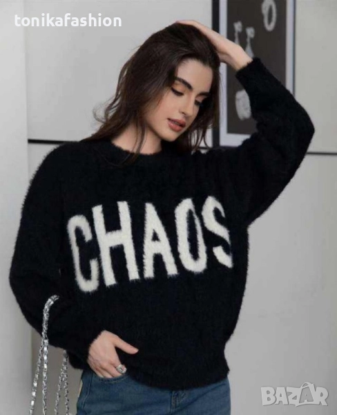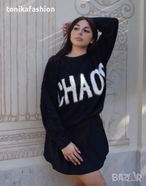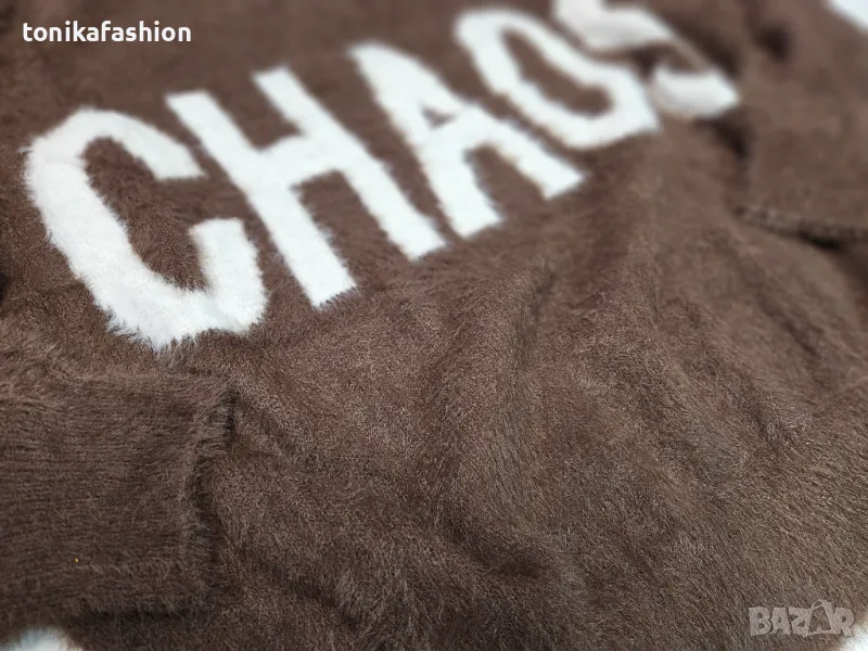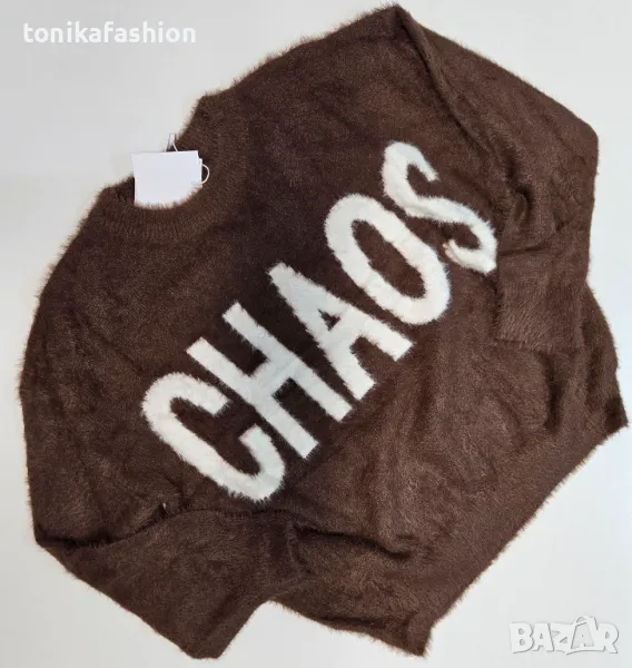 Пухкав и много мек пуловер с надпис. Обемен широк модел с паднало рамо и по стегнат ластик по дължината. Един размер подходящ за М, L, XL. Дължина 63см, подмишници 58см. Два цвята - кафяво и черно.