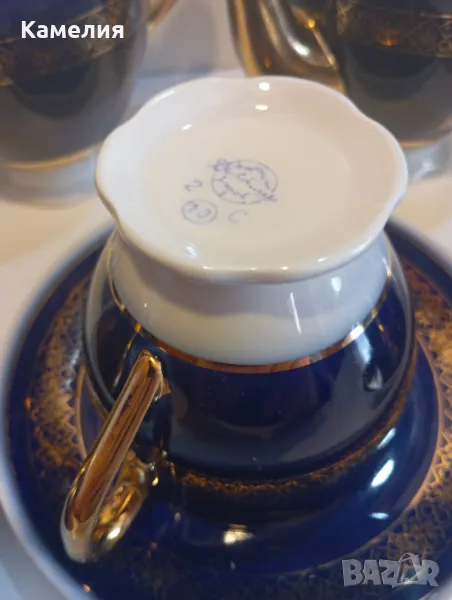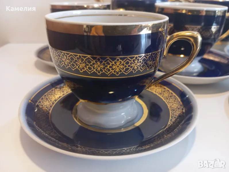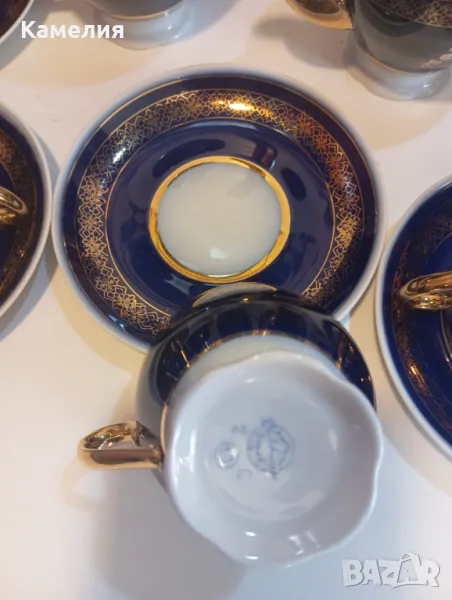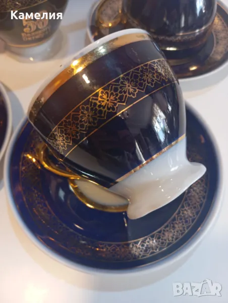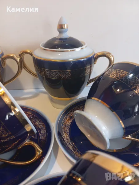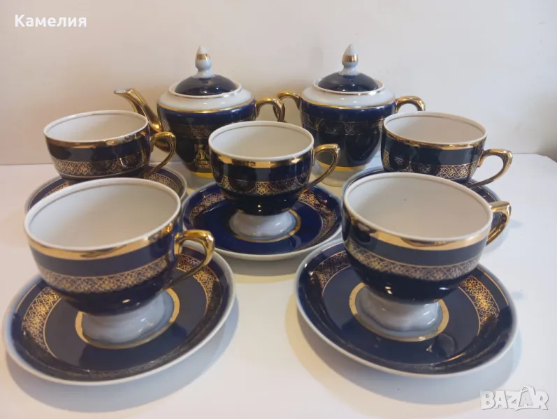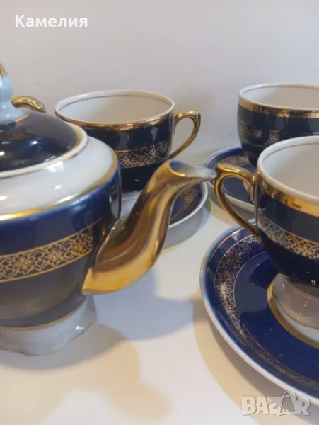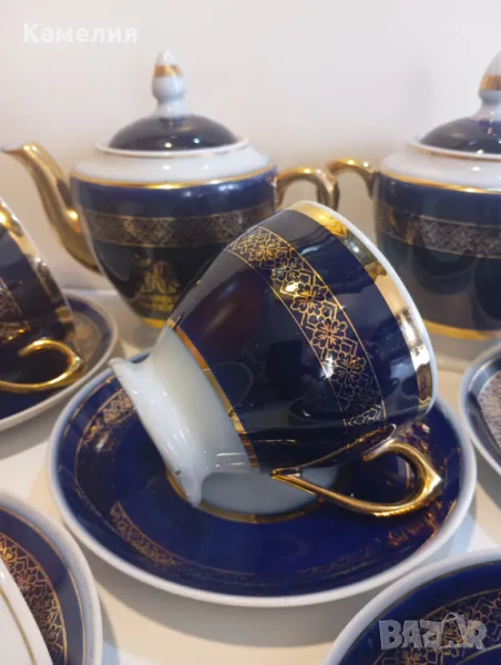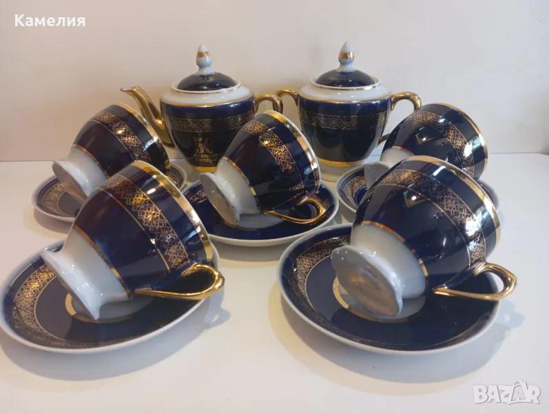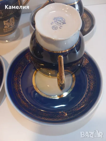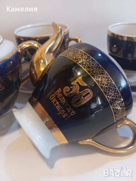 Руски ( съветски) сервиз за чай 50 години на Велик Октомври ( 50 лет Великого Октября!) Довбъшски, 60-е години. Рядък е. Кобалт , злато. Чайник, захарница, 5 чаши 220 мл, 5 чинийки 14 см. Сервиз не е ползван. Малка незначителна забележка по позлата на чучура( последна снимка).