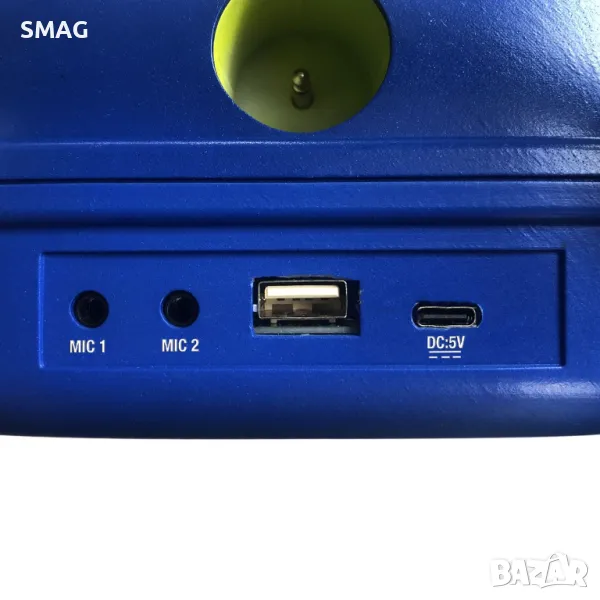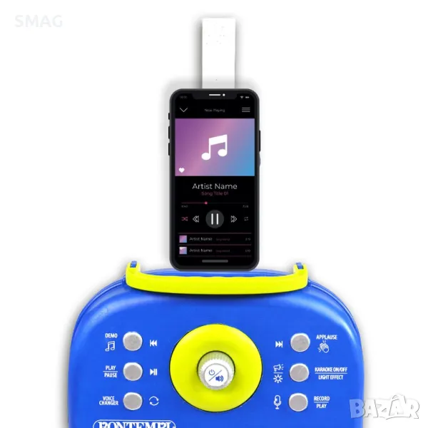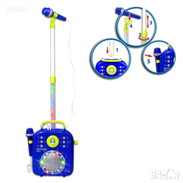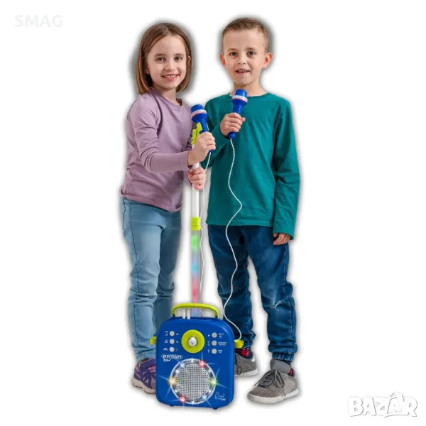 Комплект за караоке с 2 микрофона, осветление, музика и стойка. Има превключвател за включване/изключване, барабанни звуци, демонстрационна музика, пляскане с ръце и бутон за сила на звука. Работи с 3 AA батерии (не са включени).