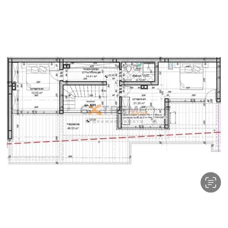 Екстрийм Варна Ви предлага чудесен панорамен мезонет на две нива с обща площ от 218 кв.м., намиращ се на ет. 9 и 10. Състои от антре 3,87 кв.м., всекидневна с кухня 40 кв.м., баня с WC 4,26 кв.м., балкон 7,50 кв.м. и лоджия 5,76 кв.м. на първо ниво, спалня 21,25 кв.м., втора спалня 13 кв.м., баня с WC 3,72 кв.м., стълбище, коридор 14,41 кв.м., южна тераса 46,53 кв.м. и маза 2,57 кв.м. Изложение: юг.