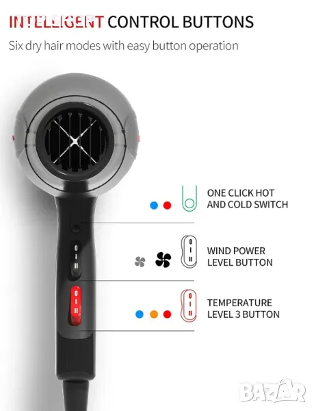 Сешоарът има три температурни настройки и две скорости, както и охлаждане с един бутон, което е много подходящо за оформяне на прическа. Антистатичният йон-керамичен грил осигурява равномерно нагряване, има функция за защита от прегряване, може да се изсушава бързо при постоянна температура, комбиниран с функцията против къдрене на отрицателни йони, което ви дава мек и блестящ ефект при всеки повод.