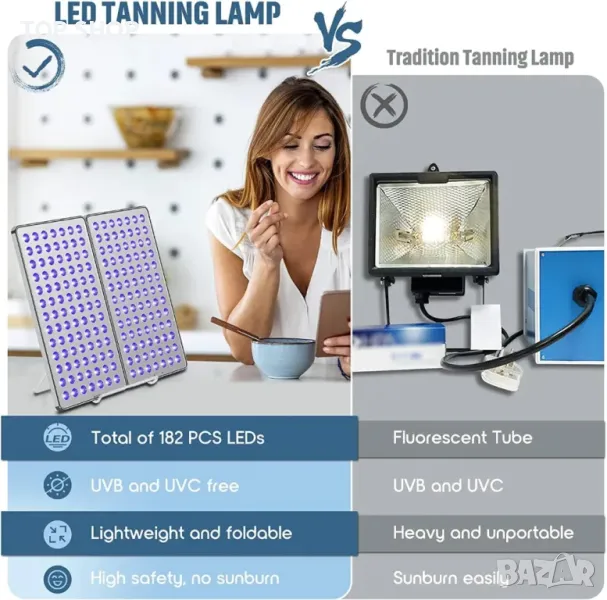Лампа за тен за домашна употреба, преносими и сгъваеми лампи за тен Cozion Лампа за тен за дома: преносима и сгъваема лампа за тен за дома, можете да се насладите на слънчеви бани у дома и лесно да получите здраво тяло. Състои се от 182 светлинни топки с дължина на вълната 365 nm-370 nm.