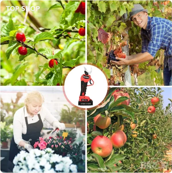 Широко използван: Електрическото рязане има широк спектър от приложения, може да се използва за всякакви градини, паркове, ферми, големи пасища, овощни градини, оранжерии. Можете да режете грозде, черешови дървета, ябълкови дървета и т.н.