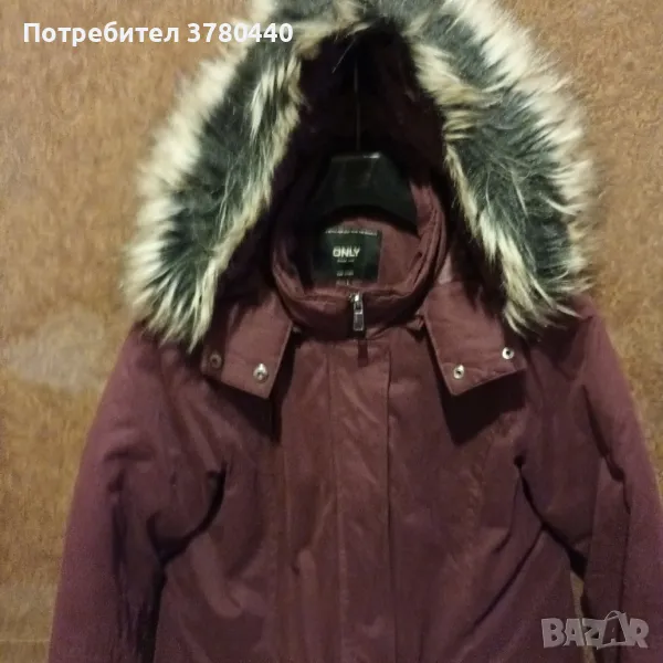 Дебела дамска спортна зимна шуба"ONLY",размер L / в см.- дължина-80см.,под мишниците-55см.,ханш-60см./.С 2 джоба с капаци.С качулка,която може да се сваля.Цвят вишнов.Закопчаване с цип и тик-так копчета.Цена 40лв.
