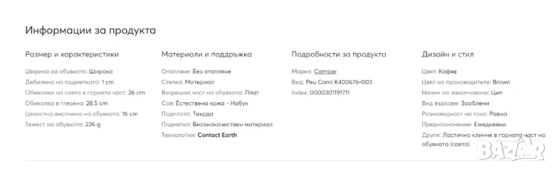перфектният избор за жени, които ценят комфорта и стила. Тези красиви кафяви ботуши са изработени от висококачествена естествена кожа - набук, което гарантира устойчивост и издръжливост. Благодарение на технологията Contact Earth, тези обувки осигуряват отлично сцепление и стабилност на всякакви повърхности. Ципът улеснява обуването и събуването, а плоският ток осигурява удобство и комфорт при дълга разходка. Вътрешността на обувките е изработена от мека материя, която осигурява максимален комфорт и удобство при носене. Кемперни ботуши - Peu Cami са идеални за есента и зимата, карайки ви да се чувствате модерни и удобни във всяка ситуация. Подметката от висококачествен материал гарантира отлично сцепление и издръжливост, а стелката от мек материал осигурява допълнителен комфорт. Тези боти до глезена са идеални за жени, които ценят комфорта и стила. Изберете марката Camper и се насладете на модерни и удобни обувки за всеки повод!