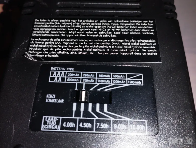 Зарядно за NiMH батерии размери AA и AAA. Ръчен избор на капацитета на батврията и времето на зареждане. Работи безупречно. Качествен уред от по-старо поколение, вече не ги правят така. :)