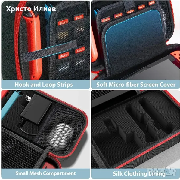 Пълна защита и лесна за носене . Кутията за съхранение на Switch е изработена от найлонов материал с отлична абсорбция на удари и е мека на допир, ефективно предпазва вашите аксесоари от прах, удари, вода и драскотини. В допълнение, той абсорбира удари от падане и удари и предпазва тялото на превключвателя от всички посоки. Лекият дизайн на калъфа за съхранение може лесно да се съхранява във вашата дамска чанта, калъф за носене и т.н., удобен за носене по време на ежедневното пътуване или пътуване