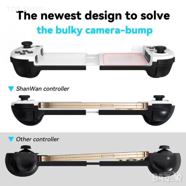 Удобен за калъф: Лявата страна на контролера има хлътнал дизайн, за да запази повече място за вашия фотоапарат и калъф за телефон. Не е необходимо да сваляте калъфа на телефона си всеки път, горната и долната част са от здрава гума, така че да не се плъзга.