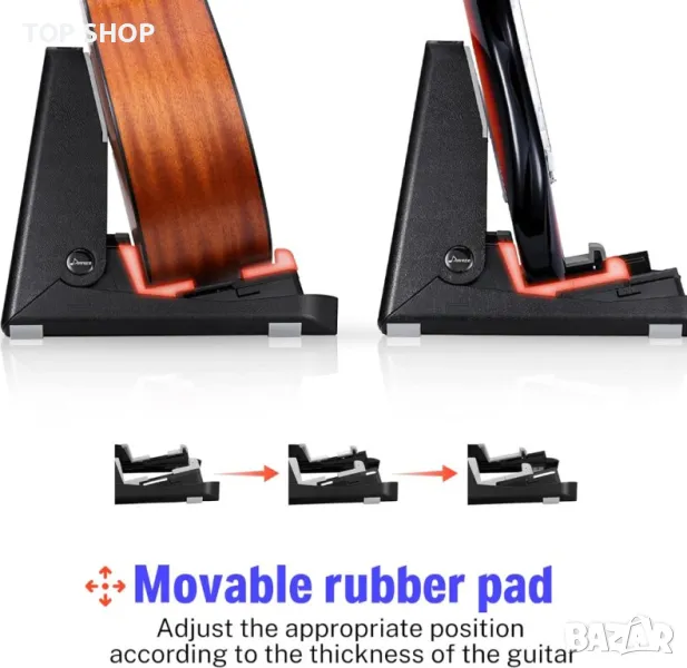 Стабилна и регулируема: Китарата може да се държи стабилно с дизайна на канала, когато стойката е разгъната. Четири гумени капачки на крачетата са против плъзгане за допълнителна стабилност. С подвижен плъзгащ жлеб можете да регулирате правилната позиция за фиксиране на инструмента според дебелината му.