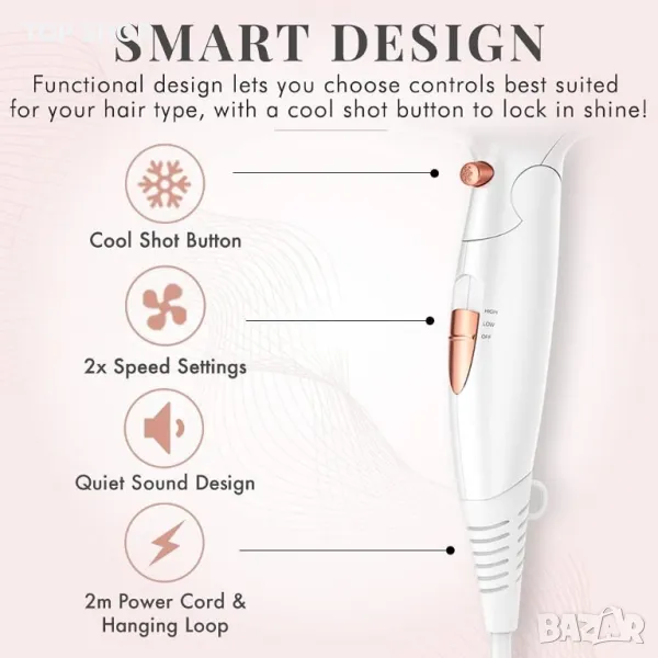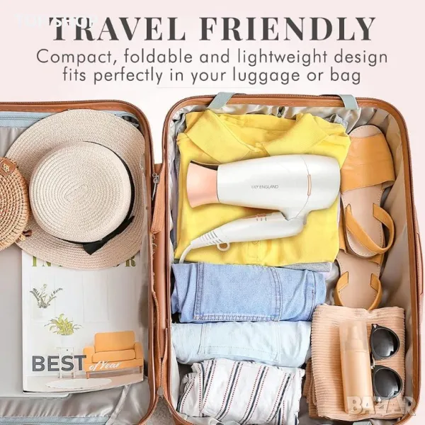 Насладете се на удобството на сгъваем сешоар, който заема минимално място в багажа ви. Нашият сгъваем сешоар е идеален за жени в движение, като ви позволява да оформяте косата си без усилие, като същевременно спестявате ценно място в чантата си