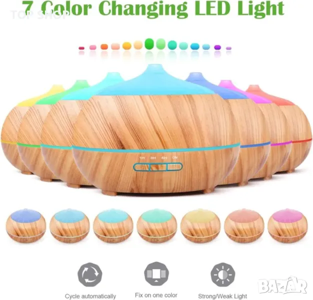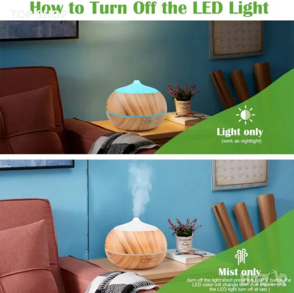 7 цвята LED светлини: този ултразвуков дифузер има 7 цвята и 2 режима, за да отговори на вашите нужди, можете да зададете режим на автоматичен цикъл или фиксиран цвят, всеки цвят съдържа два режима, ярък и заглушен, цветната светлина и функцията за ароматерапия могат да бъдат използва се отделно, като нощна лампа или като лампа за изключване.