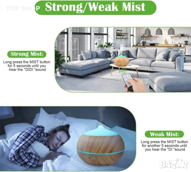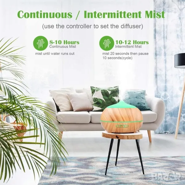 Резервоар за вода от 500 ml с голям капацитет: нашият дифузор за етерично масло е с капацитет 500 ml и време на работа до 10 часа. Осигурява стаи от 10 до 60 квадратни метра със свеж и влажен въздух и може да освободи толкова много аромат, който ще оживи цялата къща. Този овлажнител с дифузер много тихо изпарява водата и етеричните масла в резервоара, за да създаде релаксираща атмосфера. Перфектен за спални, всекидневни, офиси, йога и др.