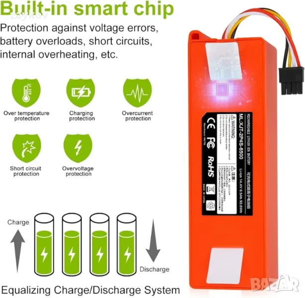 Батерия с голям капацитет: тип: литиево-йонна, напрежение: 14,4 V, капацитет: 6500 mAh, мощност: 93,6 вата, осигурява стабилно захранване за Xiaomi Mijia Roborock.