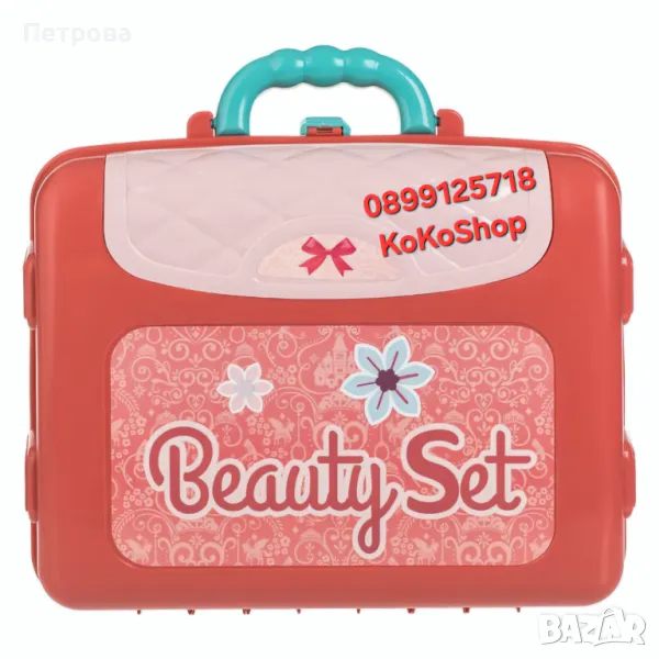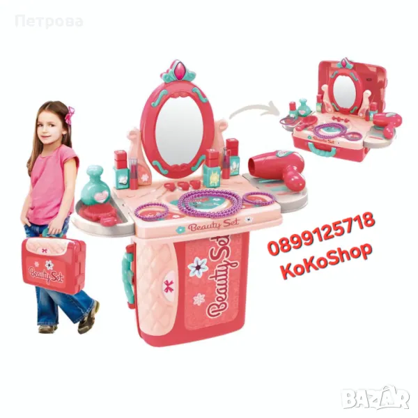 Детска тоалетка-куфарче с огледало и 14 аксесоара. Куфарчето бързо се трансформира в атрактивна тоалетка с огледало. Комплектът включва сешоар,четка за коса,червило,лакове за нокти,парфюм и бижута.