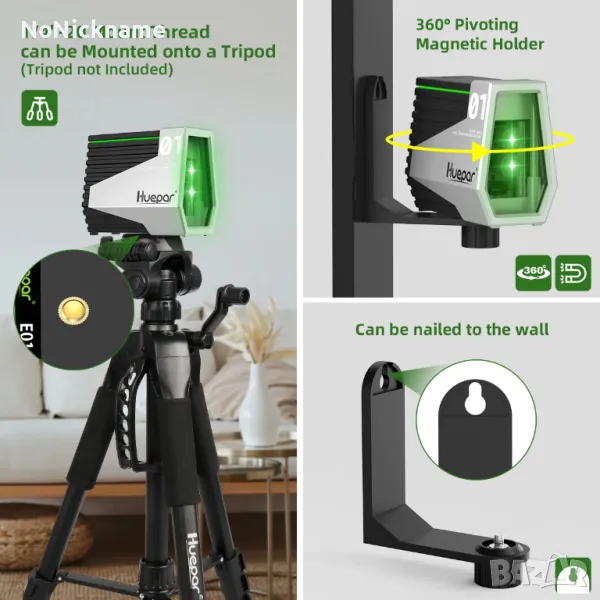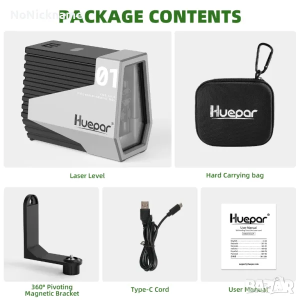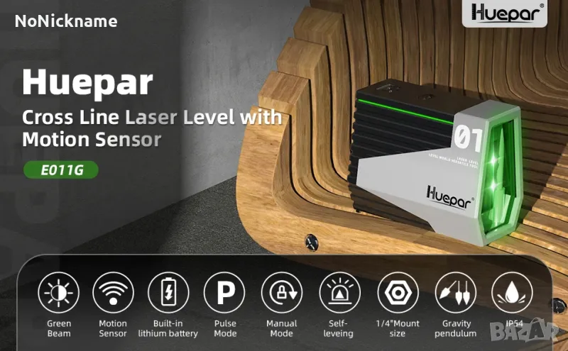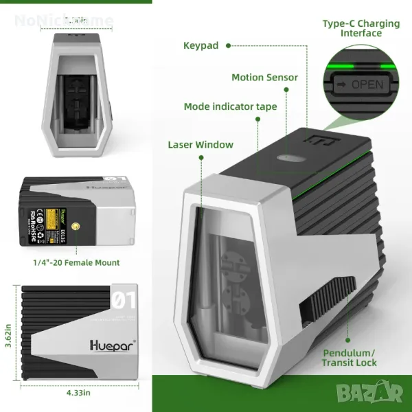 Huepar E011G лазерен нивелир зелен самонивелиращ се с кръстосани линии нивел лазер