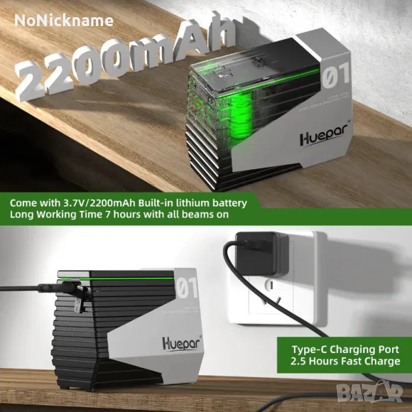 • Литиева батерия с голям капацитет: Лазерният нивелир Huepar E011G използва 3,7 V / 2200 mAh вградена презареждаема литиево-йонна батерия, отнема само 2 часа, за да се зареди напълно. Най-дългото работно време е до 7 часа, може да задоволи вашите работни нужди през целия ден. Чрез Type-C порта за зареждане можете директно да включите Power bank, лаптоп или всеки друг USB адаптер за да заредите лазерния нивелир.