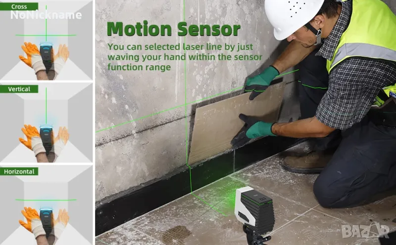 • Сензор за движение: Този лазерен нивелир използва инфрачервен сензор, като махнете с ръка, за да превключите кръстосани линии, хоризонтална или вертикална линия -3 режима на линия, няма нужда да докосвате бутона. Може да се работи и с мокри ръце или с ръкавици. Разстоянието на засичане е 0-10 см. Може да Ви спести много време и да улесни работата Ви.