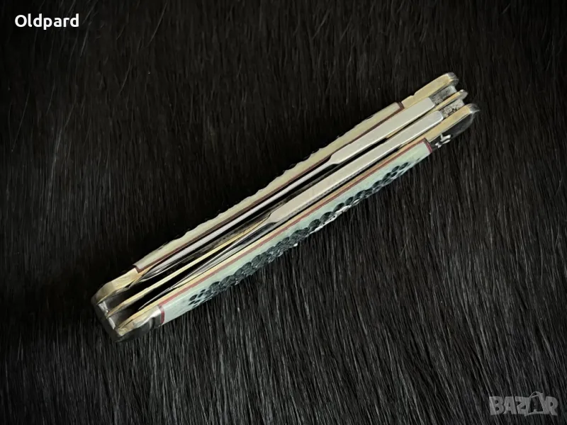 Болстер от никел сребро с огледално покритие и гравиране остриета. Дръжка от кост. Подарочна в кутия. Дължина на острието - 8,0 см. В сгънато състояние дължината на ножа е 10,3 см. Този нож е чудесен продукт за ползване или колекциониране, както и чудесен подарък за всякакви поводи.