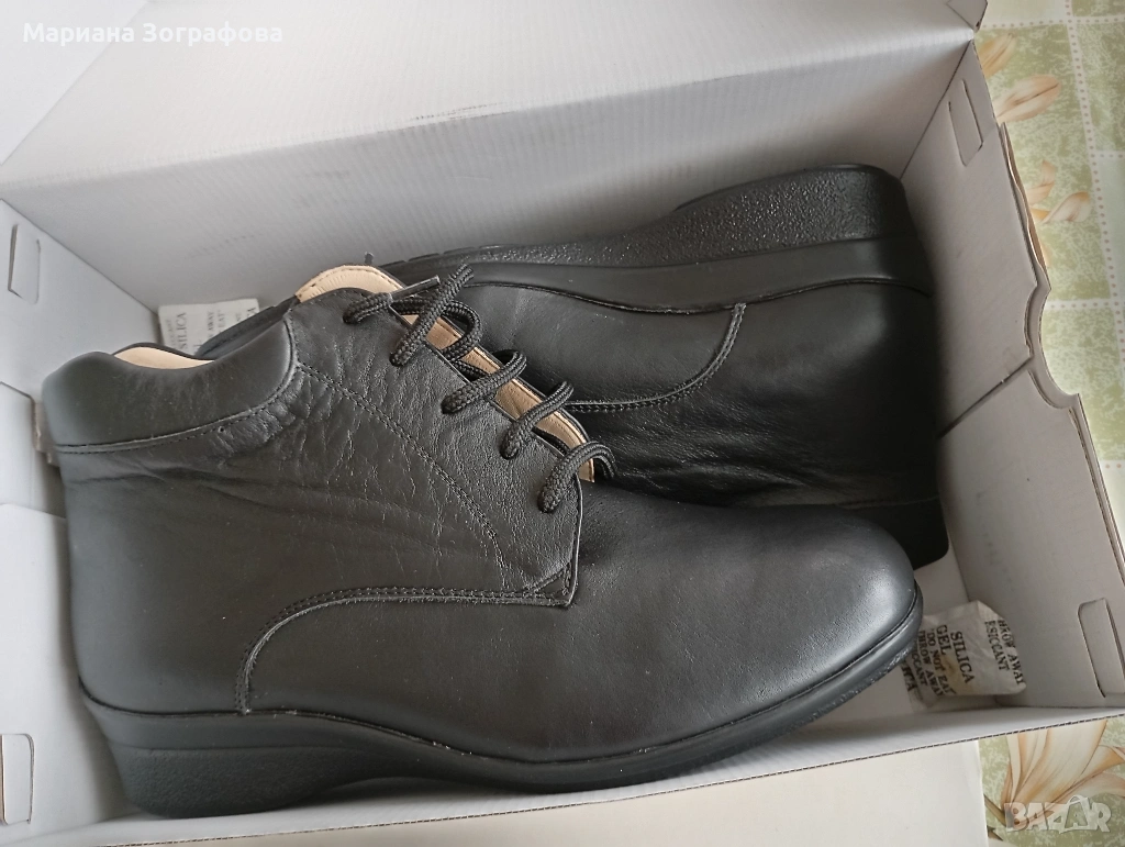 Подплата от втори слой естествена кожа и мека подвижна стелка от естествена кожа и мемори пяна за удобство при чувствителни крака.