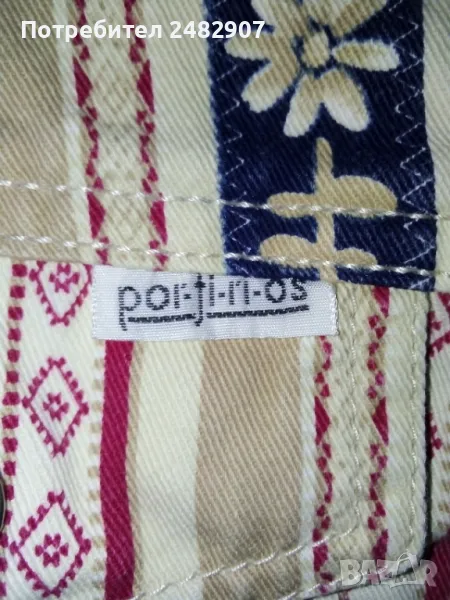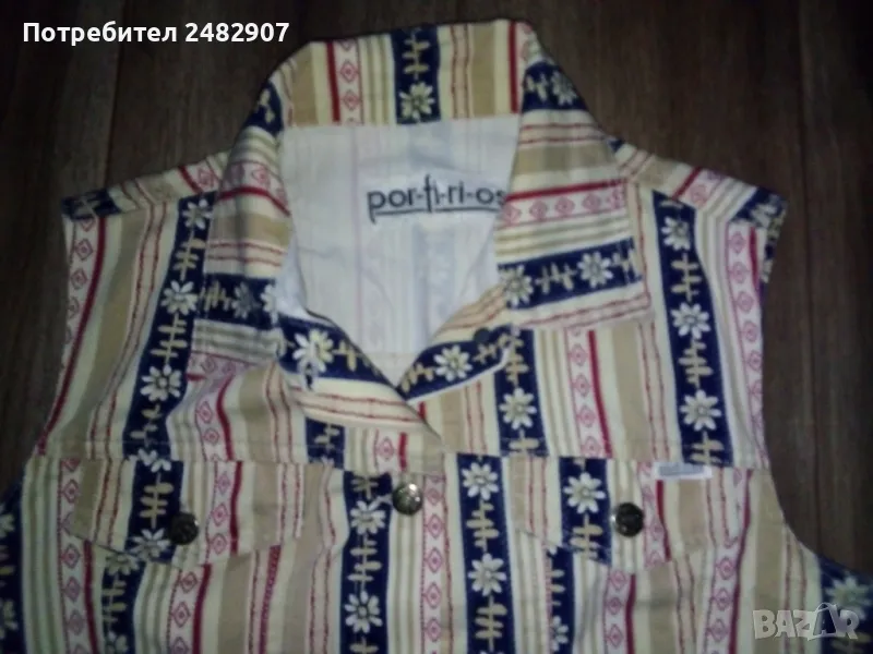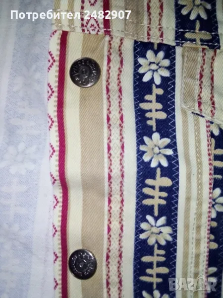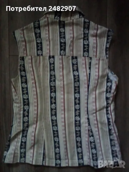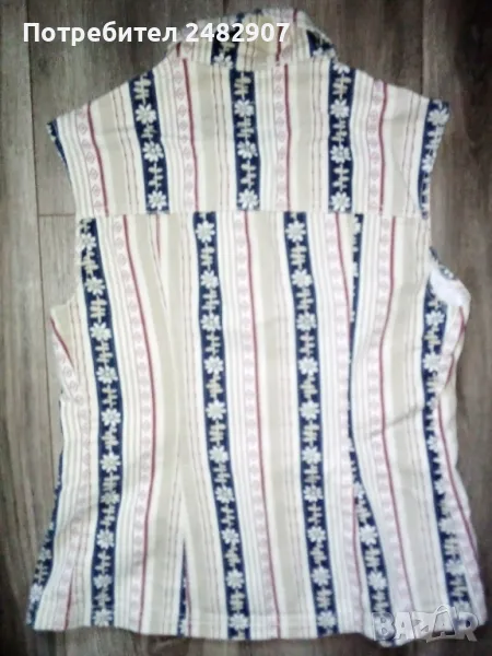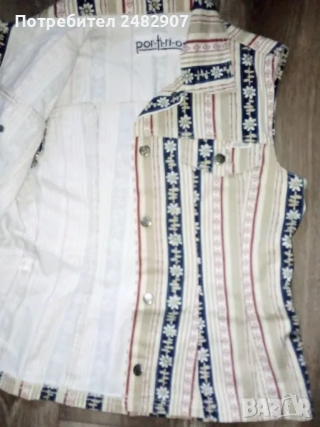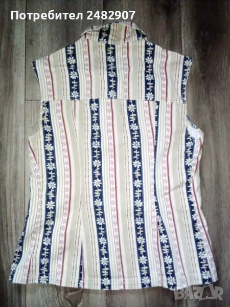 Дамско дънково елече, размер М. Съдържа 100 % памук. Ширина в раменете - 39 см, ширина под мишниците - 47 см, ширина в долната част - 54 см, дължина от рамото до долу - 59 см. Много запазено, почти не е използвано. Закопчаване - с 5 броя метални копчета, с яка и имитация на два горни предни джоба, вталено, без забележки, неразличимо от ново.
