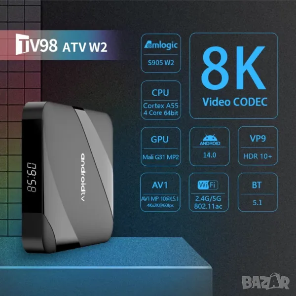 CPU: Amlogic S905W2 до 1,2 GHz, четириядрен ARM Cortex-A35.