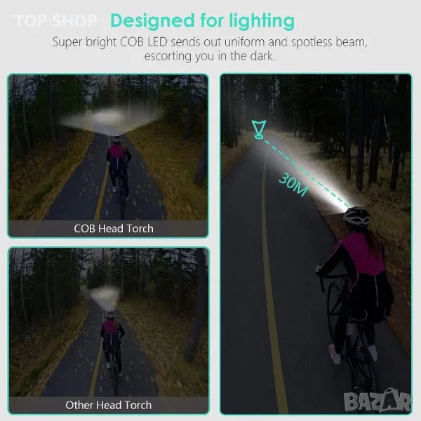 Супер ярък COB LED фар: Усъвършенстваният COB фенер е по-ярък и по-енергийно ефективен от конвенционалните LED фарове и предизвиква значително подобрение в живота на една батерия. Обхватът на облъчване от 30M може да бъде безпрепятствен в тъмна среда, осигурявайки ви постоянно осветление с висока яркост по всяко време.