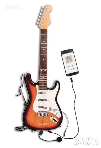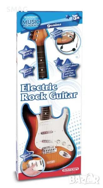 Електрическа играчка китара с презрамка, метални струни с рок звук, стоп бутон, слот за липофон, избор и възпроизвеждане на демо записи и слот за връзка с Mp3 плеър, iPod, смартфон и др. Работи с 3 батерии АА (не са включени в комплекта) ).