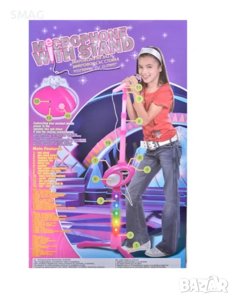 Микрофон със стойка, идеален за малки момичета, които искат да тренират и да се забавляват с музика! Има място за свързване на вашия музикален плейър към високоговорителя и възпроизвеждане на музика от там.
