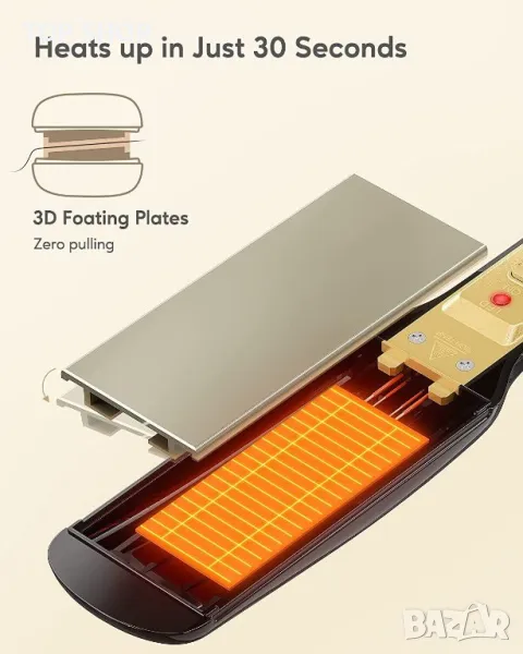 3D плаваща титаниева преса: Тази преса има професионален 3D плаващ титанов нагревател, който може да се нагрее за 30 секунди и да поддържа равномерно разпределение на топлината от корена до върха за дълготрайна прическа. Избягвайте да дърпате или увреждате косата си, докато оформяте. Пресата е идеалното решение за права, гладка и блестяща коса.