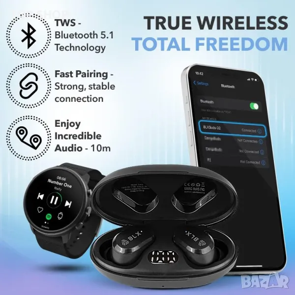 ВОДЕЩИ В ОТРАСЛА 5.1 BLUETOOTH БЕЗЖИЧНИ СЛУШАЛКИ С TWS ТЕХНОЛОГИЯ - Насладете се на аудио по безжичен начин с чисто новите безжични слушалки Blx Buds за iPhone. Нашите безжични Bluetooth слушалки за iPhone осигуряват завладяващ звук с усъвършенствана TWS и 5.1 Bluetooth технология за слушалки. Наистина безжични слушалки с микрофон за висококачествено безжично слушане!