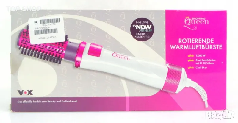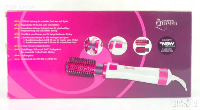 Въртящата се четка с горещ въздух от колекцията Shopping Queen ви позволява да сушите, да придадете обем, да извиете, да оформите - всичко това с една ръка. Четката с горещ въздух може да се използва като сешоар благодарение на мощността си от 1000 вата или можете да я вземете със себе си