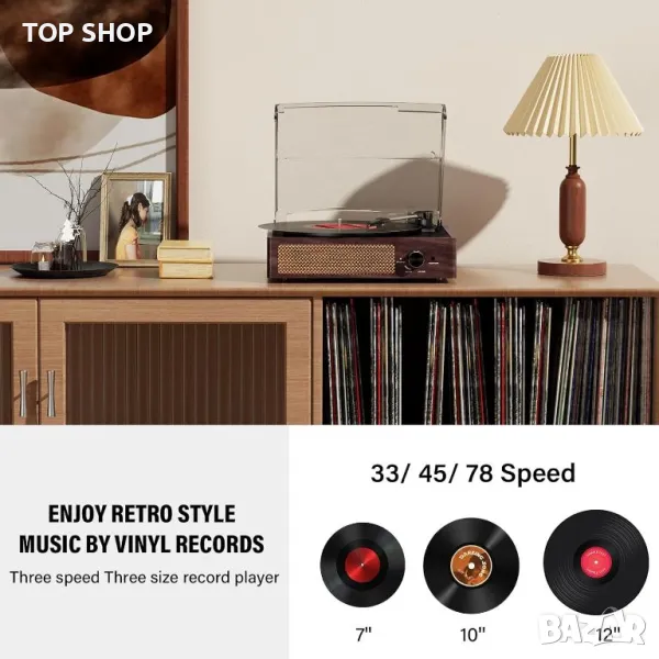 Относно този артикул 3-скоростен Recrd Player с ремъчно задвижване - Поддържа 33-1/3 RPM, 45 RPM, 78 RPM скорост на възпроизвеждане, което ви позволява да се наслаждавате на всичките си винилови плочи. Фантастичен Bluetooth грамофон - Свържете се безпроблемно с вашето устройство с Bluetooth, за да се наслаждавате на любимата си цифрова музика. Вграден стерео високоговорител-Този плейър е с вграден стерео високоговорител, можете да го използвате, за да възпроизвеждате любимата си музика. Стилусът с висока чувствителност може да прочете информацията за записа точно. 3,5 mm Aux-in & RCA изход-3,5 mm жак за възпроизвеждане на музика от други аудио устройства. RCA жаковете ви позволяват да свържете друг усилвател или стерео система, за да получите по-добро слушане. (включва кабели) Винтидж дизайн - Естествено дърво, проектирано с подвижен защитен капак против прах и лесен за управление панел с множество връзки. Може да ви донесе удоволствие от музиката, но също така да украси стаята ви, за да създаде приятно и релаксиращо усещане наоколо!