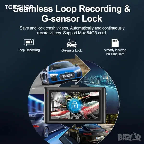 Автоматичен цикличен запис: Предната и задната камера на Yansoo поддържа функция за цикличен запис, за да записва непрекъснато на всеки 1, 3 или 5 минути и автоматично да ги запазва. Моля, натиснете “M”, за да влезете в настройките на менюто и да намерите “Loop Recording”, Препоръчва се да настроите 3 минути. Когато картата с памет е пълна, предната и задната камера на таблото за автомобили автоматично презаписват най-старите видеоклипове, но видеоклиповете със заключване не покриват. (Забележка: поддържа до 64GB карти.)