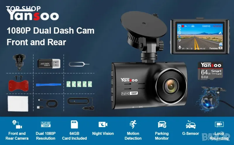 Нови подобрени функции за 2024 г. -- Yansoo A88A Dash Cam отпред и отзад: ✅ В сравнение с други 720P задни камери, Yansoo надстрои до 1080P-AHD задна камера с оригинално изображение. ✅ Включете 64GB карта, не е необходимо да купувате карта с памет отделно. ✅Идва с 2 вида вендузи. Вендузите позволяват гъвкаво поставяне на видеорегистраторите, докато скобата 3M стабилизира позицията на видеорегистраторите. ✅Зарядно за кола с USB порт, когато използвате камера за автомобилно табло, поддържа зареждане на други електронни устройства едновременно.