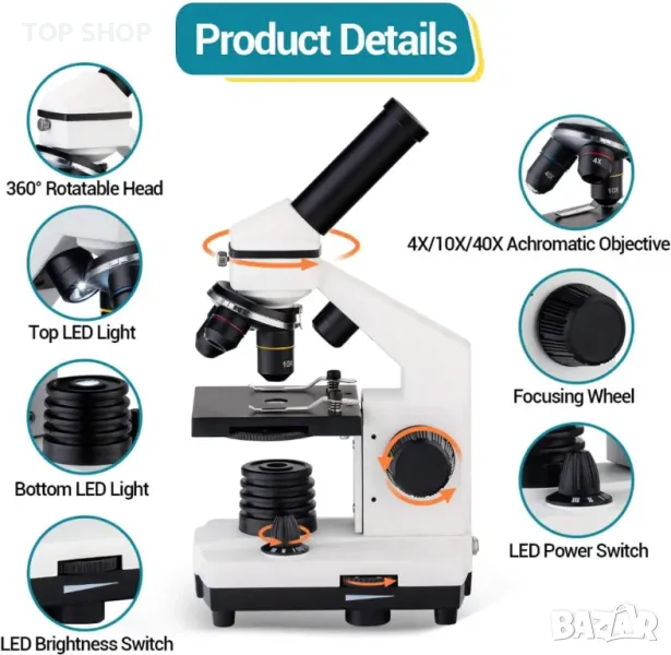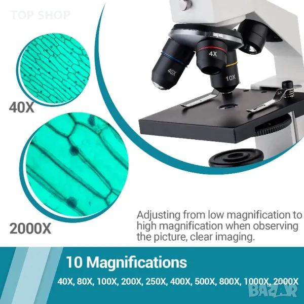Оборудван с 4x, 10x и 40x ахроматични обективи с до 2000x увеличение, можете да изследвате очарователния свят на микроскопията.