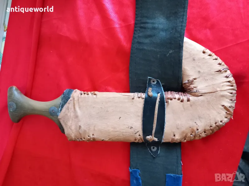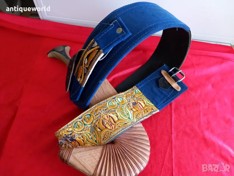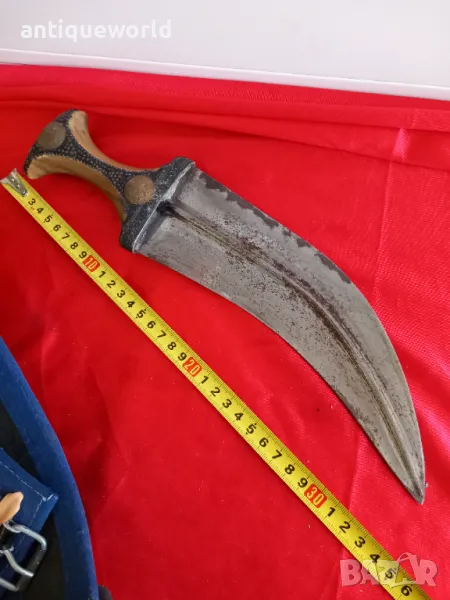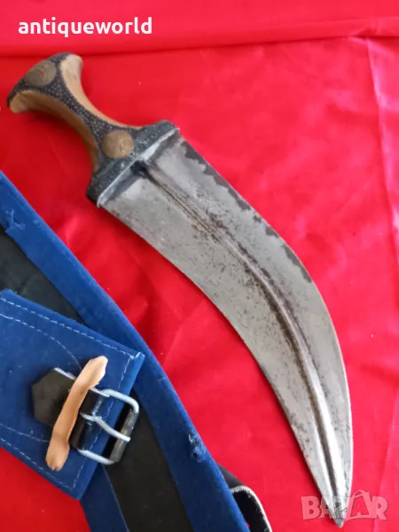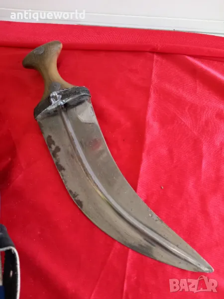 Красив Стар ХАНДЖАР, Кинджал,Кама , Острие.Дръжка от Кост от Носорог със Сребърни орнаменти.Дървена Кания с Кожа. Лека забележка малко закъсване по колана.
