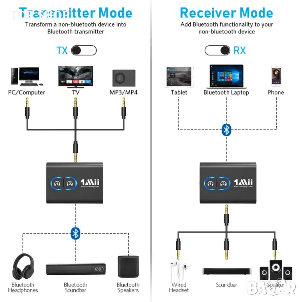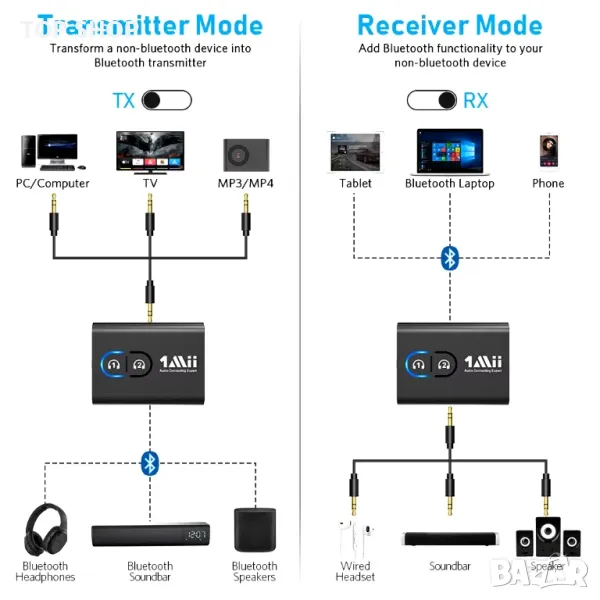 1Mii Bluetooth аудио предавател поддържа режим на предавател и приемник. В режим на предавател е много лесно да превърнете не-Bluetooth телевизор или компютър в Bluetooth предавател. В режим на приемник чипът Bluetooth 5.0 осигурява висококачествен Bluetooth аудио сигнал за поточно предаване на музика към онези високоговорители или домашни стерео системи, които нямат тази възможност.
