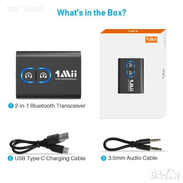 【ПРЕДАВАТЕЛ И ПРИЕМНИК 2-В-1】1Mii Bluetooth аудио предавател поддържа режим на предавател и приемник. В режим на предавател е много лесно да превърнете не-Bluetooth телевизор, компютър, фитнес/летателно оборудване в Bluetooth предавател. В режим на приемник чипът Bluetooth 5.3 осигурява висококачествен Bluetooth аудио сигнал за поточно предаване на музика към онези високоговорители или стереосистеми за кола/домашна среда, които нямат тази възможност.