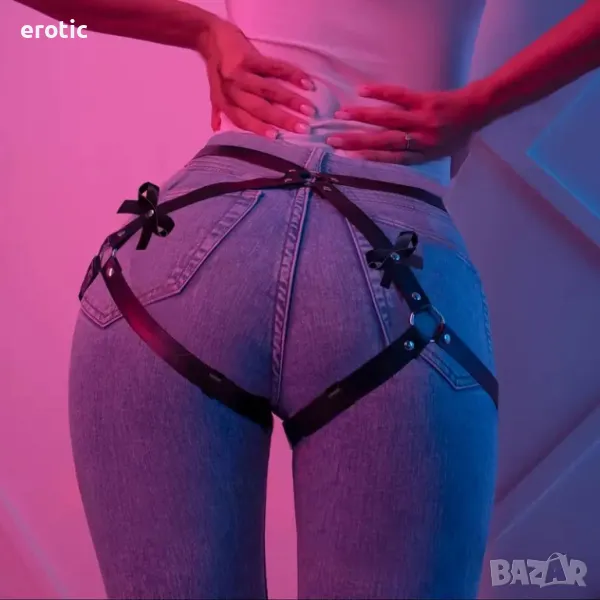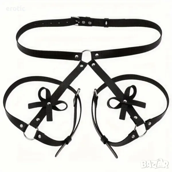 Черен секси колан от изкуствена кожа с панделка. Фънки колан за крака - уникален аксесоар с регулируеми презрамки и металини детайли. Дамски готически колан от изкуствена кожа с презрамки и панделки, секси аксесоар за костюми за парти BDSM за възрастни, плътен цвят, без сутиен, неразтеглив.