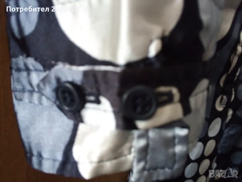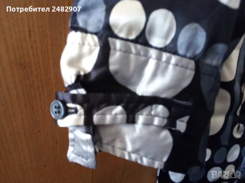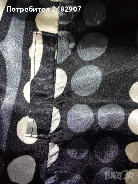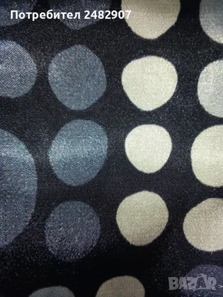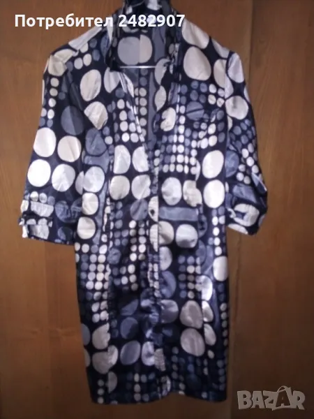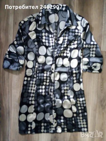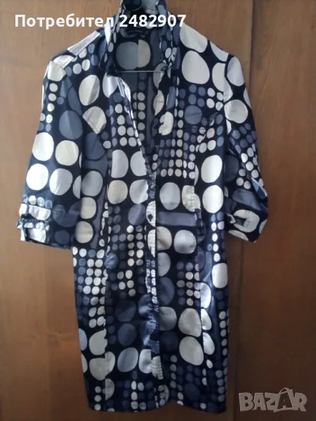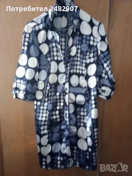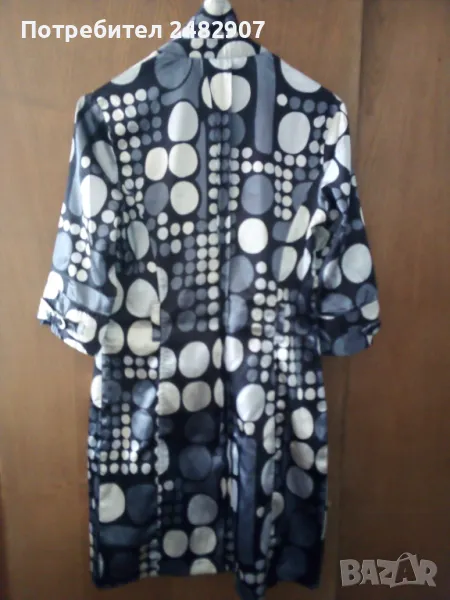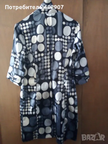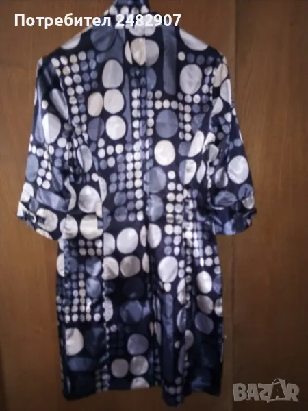 Елегантна дамска рокля от сатен, със 7/8 ръкав, размер М. Ширина в раменете - 37 см, ширина под мишниците - 44, см, ширина в долната част - 46 см, дължина от рамото до долу - 83 см, дължина на ръкава от рамото - 37 см, ширина на ръкава в долната част - 13 см. Много запазена, обличана е веднъж за повод, закопчаване - с 8 броя черни малки копчета отпред, с яка, ефектни ръкави и гайки в талията. Леко еластична, вталена.
