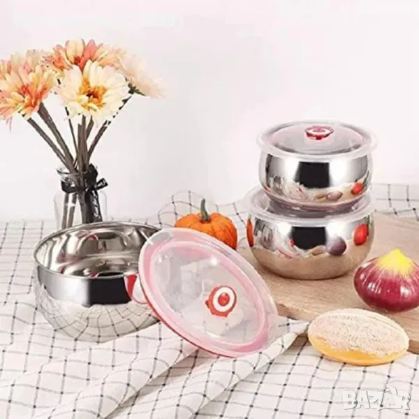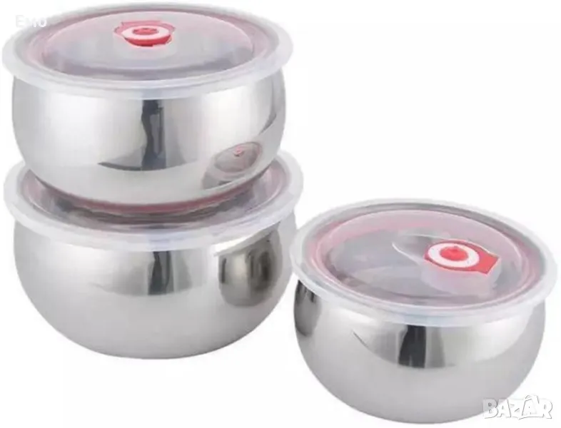 Комплектът от три купи от неръждаема стомана с капаци е перфектното решение за всяка кухня.