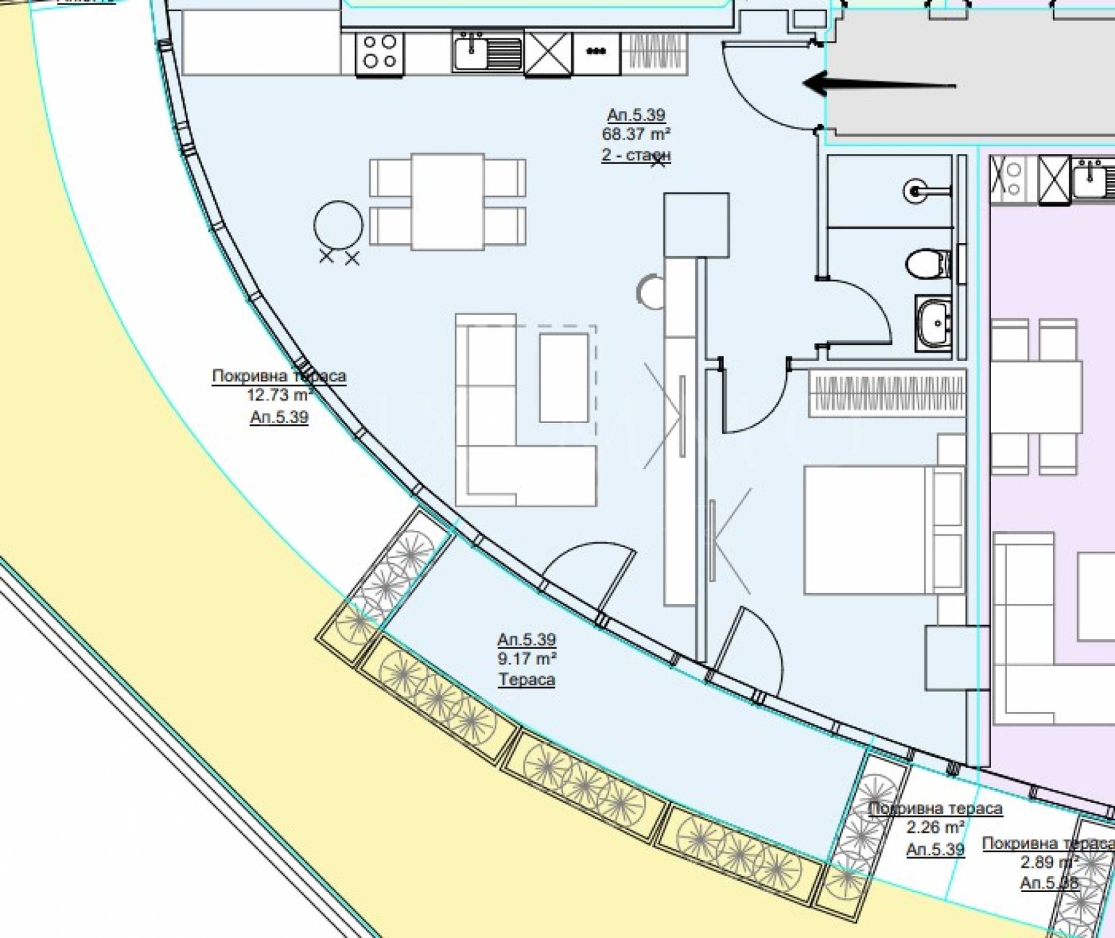 Ексклузивно представяме за продажба двустаен апартамент в сграда S-Tower - нов проект с отличителен дизайн, висок клас на изпълнение, комуникативна локация и отлична възможност за инвестиция. Проектът е дело на арх. Ангел Захариев и неговия екип, печелили неведнъж престижната награда 'Сграда на годината'. Сградата е с изключителна визия и ще се превърне в емблема за столицата ни. Апартаментът е ситуиран на 5-и етаж от общо 15 и предлага обща площ 96.07 кв.м (нетна площ 77.54 кв.м + общи части 18.53 кв.м). Имотът е с благоприятно изложение - юг/югозапад. Предлага се завършен по БДС, с блиндирана входна врата Solid и алуминиева дограма от висок клас с термомост и троен стъклопакет. Сградата ще разполага с климатична инсталация и ТЕЦ. Разпределение: антре, баня с тоалетна; една спалня; просторна дневна с кухня; тераса с излаз от двете стаи. Към жилището има възможност за закупуване на подземно паркомясто на цена от 36 000 евро. S-Tower e разположена на бул. 'Г.М. Димитров' - един от емблематичните за нашия град булеварди, на който се извисяват множество ключови за София сгради - бизнес сгради от клас А, магазини, четиризвездния бизнес хотел 'Вега', един от най-добрите СПА центрове в столицата ни - Este Fitness & SPA. Апартаментите в района са с много добра възвращаемост и с високи наемни цени, което прави инвестицията в недвижими имоти в района сигурна и печеливша. S-Tower е многофункционална сграда, извисяваща се на 15 етажа, със 104 луксозни апартамента, 2 впечатляващи пентхауса, 6 офиса, ресторант и 3 магазина. Дизайнът е футуристичен, с разчупени форми и окачена стъклена фасада, изцяло изпълнена с алуминиеви елементи в цвят розово злато. Всички общи части са решени в елегантен и модерен стил, а за лобито инвеститорът предвижда луксозно довършване и 3D мапинг ефект. В строителството ще се използват материали от най-висок клас, осигуряващи дълговечност и лесна поддръжка на сградата във времето, а свободните пространства край сградата ...