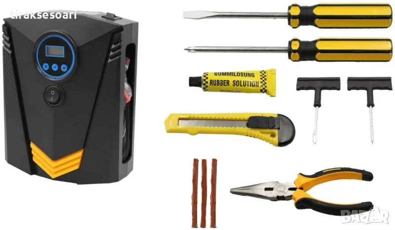 Комплект инструменти за помпа за надуване с въздушен компресор за по-лесен и удобен ремонт на гуми и помпане в случай на спешност.