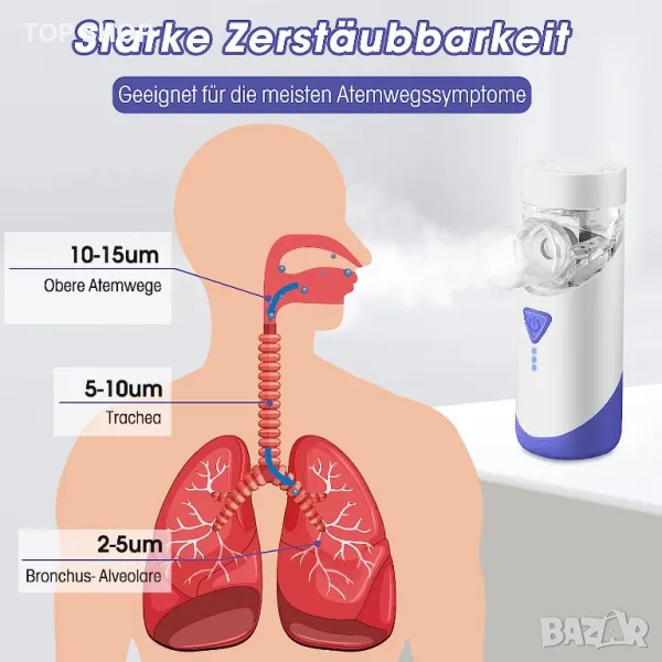 Небулизатор с микромрежа: инхалаторният пулверизатор използва технология с микропореста мрежа, може бързо и ефективно да превключва от течност към мъгла. Капацитетът на освобождаване на мъгла на пулверизатора може да бъде 4-8 литра в минута, пулверизираните частици са 3-5 μm, остатъкът от лекарството е по-малък от 0,01 ml. За по-добро абсорбиране на малки частици, което се отнася за повечето респираторни заболявания.