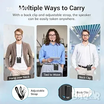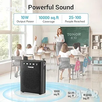 Мощен звук: Този преносим гласов усилвател, въпреки компактния си размер, разполага със здрав изход от 10 W, който осигурява кристално чист звук, покриващ до 10 000 квадратни фута без шумови смущения. Мощният му обем е достатъчен за голяма стая, която може да побере 25-100 души, като гарантира, че гласът ви е ефективно усилен.