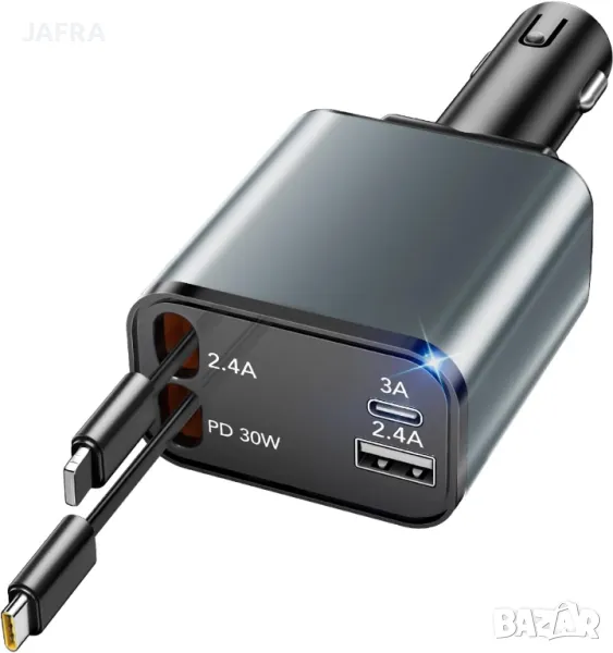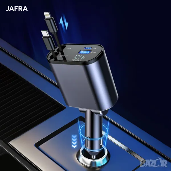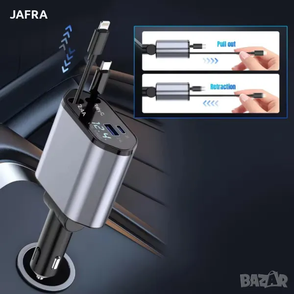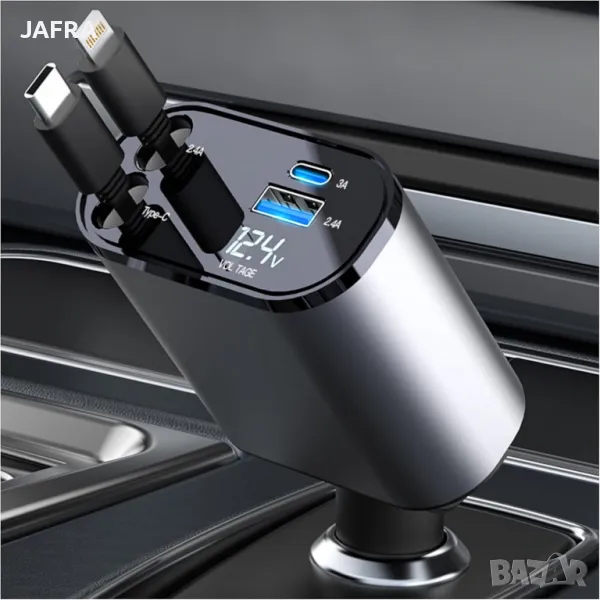 🚗 4-в-1 Бързо Зарядно за Кола с Прибиращи се Кабели, LED Дисплей и Мощност 100W
