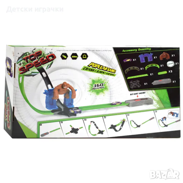 1. Впечатляващ кръг на 360⁰ лупинг: Състезателната писта има специален контур, по който малката кола се върти и плъзга, гарантирайки вълнуващо игрово изживяване.