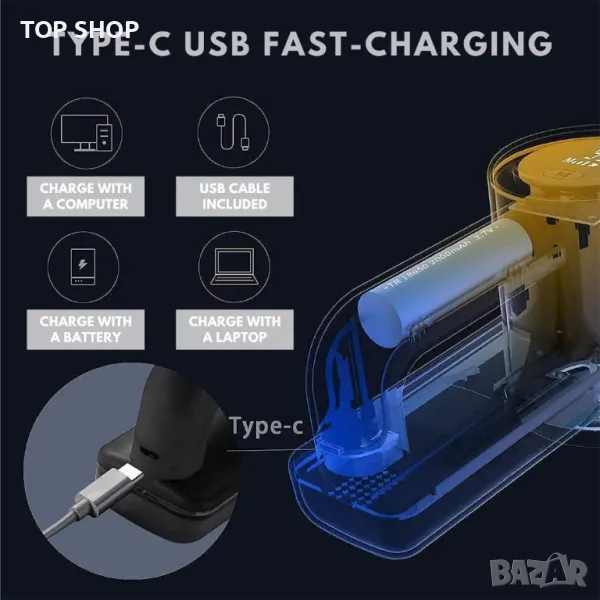 【ДЪЛЪГ ЖИВОТ НА БАТЕРИЯТА】Вградена 2000mAh литиево-йонна акумулаторна батерия. Устройството може да се използва до 3 часа с пълна батерия. Заредете батерията чрез USB тип-C, като използвате захранваща банка, лаптоп или зарядно за телефон.